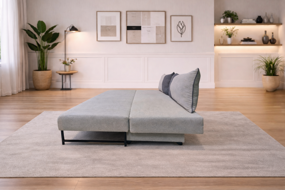 ספת אירוח קאסטרו בעיצוב מודרני ונקי. הספה עשויה מבד איכותי בצבע אפור בהיר, עם תמיכה מרבית למושב ולגב, וכוללת כריות נוחות. בנוסף, הספה נפתחת בקלות למיטה, מה שהופך אותה לפתרון מושלם לאורחים. הרגליים השחורות מעניקות לספה מראה מעודכן ומרשים, והיא מתאימה לכל חלל סלון או חדר אורחים.