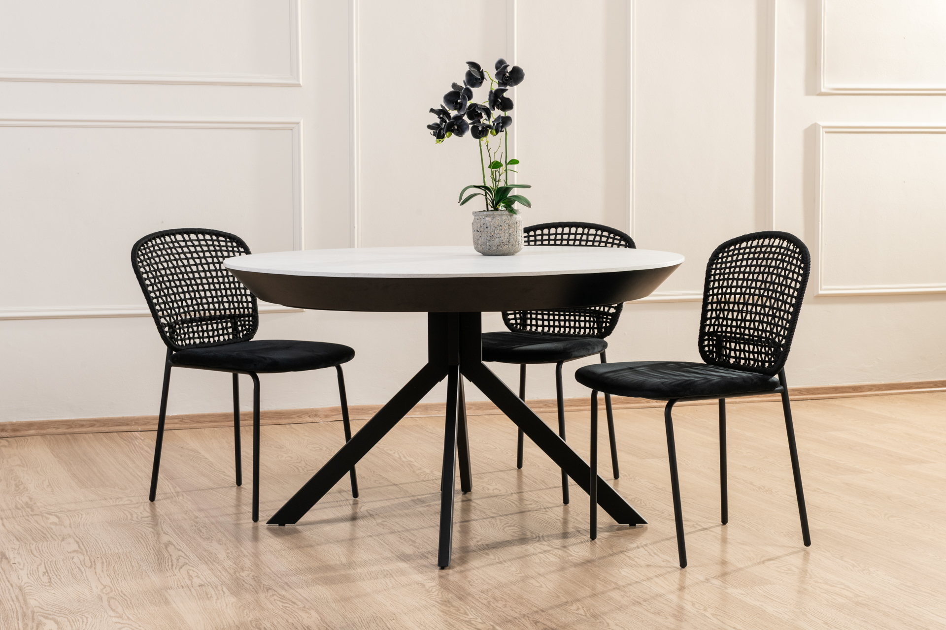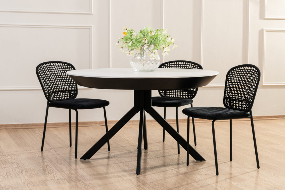 כיסאות קולינס מציעים שילוב מדויק בין עיצוב מודרני, נוחות יומיומית ומראה קליל ואלגנטי. הכיסאות מתאפיינים בגב רשת מעוצב המעניק תחושת אווריריות ותמיכה נעימה לגב, יחד עם מושב מרופד ונוח לישיבה ממושכת. שלד מתכת שחור ודק שומר על מראה מינימליסטי ויציב, ומתאים לחללי אוכל מודרניים ועכשוויים. כיסאות קולינס משתלבים בצורה מושלמת סביב שולחן אוכל עגול כמו דגם דאגלס, אך עומדים בפני עצמם גם כבחירה עיצובית בולטת לפינת אוכל, מטבח או חלל אירוח.
