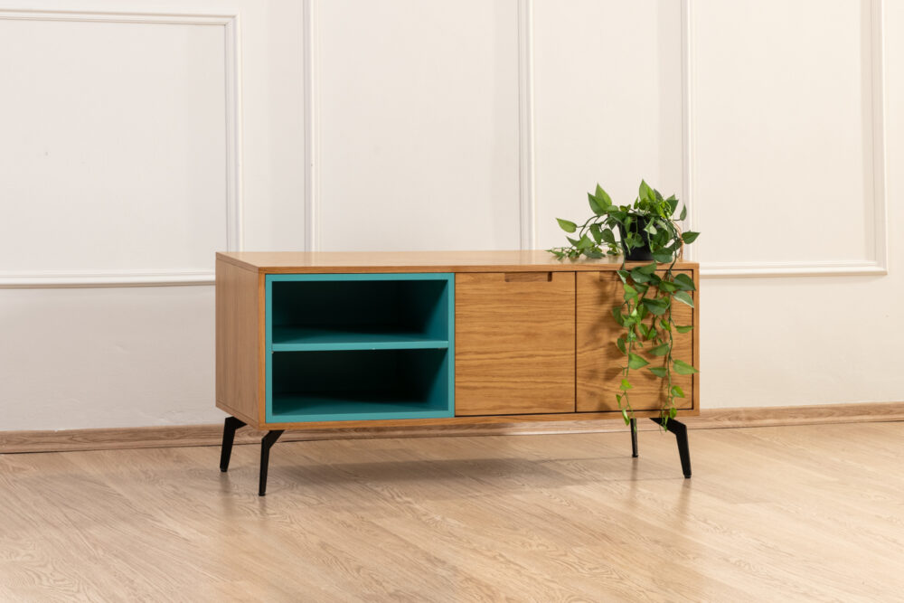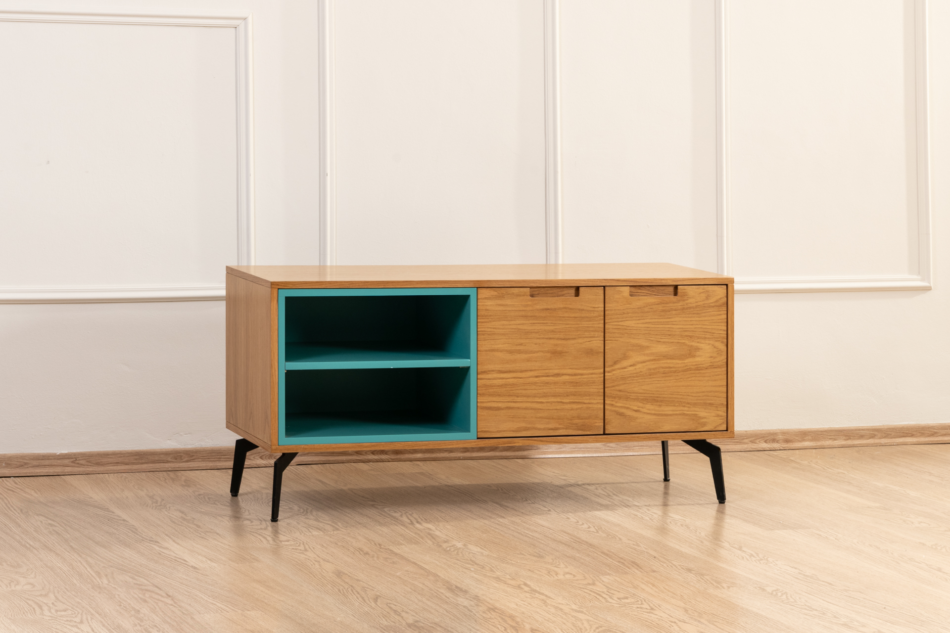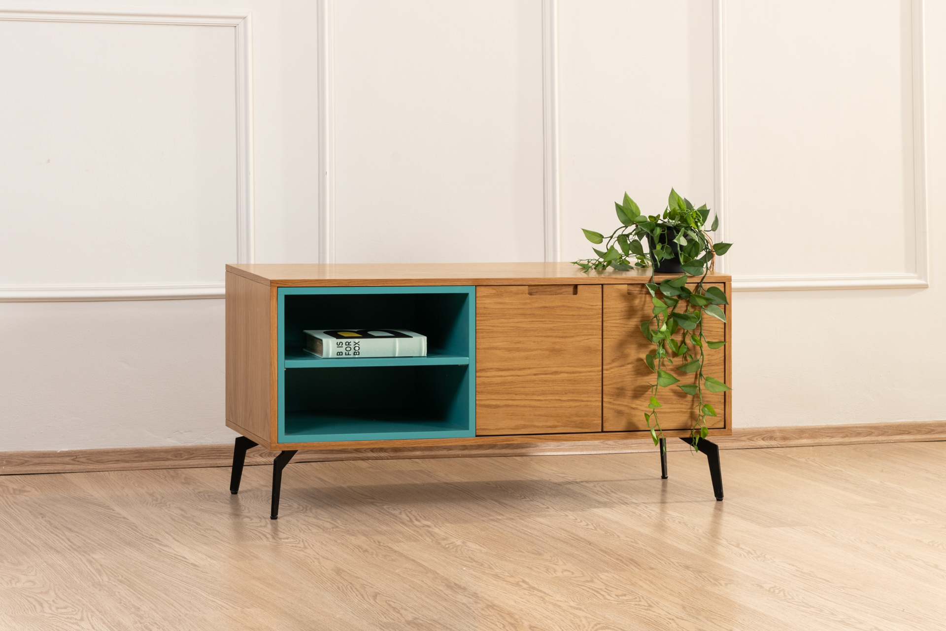 מזנון ערבה מציג עיצוב מודרני עם טוויסט ייחודי של צבע וניקיון צורני. גוף המזנון עשוי עץ בגימור פורניר עץ אלון, בשילוב תא פתוח בגוון טורקיז שמוסיף עניין עיצובי ונוכחות רעננה לחלל. הדלתות החלקות שומרות על מראה מינימליסטי ומאפשרות אחסון נסתר ונוח, בעוד התא הפתוח מתאים להצגת ספרים, פריטי נוי או אביזרי מדיה. רגלי מתכת שחורות ודקות יוצרות מראה קליל ומודרני, ומגביהות את המזנון לנוחות שימוש וניקוי. מזנון ערבה מתאים לסלון מודרני, לחלל אירוח או לפינת טלוויזיה בעיצוב עכשווי.
