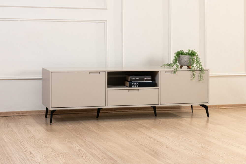 מזנון ערבה הוא מזנון מעוצב בקווים נקיים ומודרניים, המשלב פונקציונליות גבוהה עם מראה אלגנטי ומעודן. המזנון כולל חזית חלקה בגוון בהיר, חלוקת אחסון חכמה עם דלתות סגורות, מגירה מרכזית ותא פתוח לנגישות יומיומית. רגלי מתכת שחורות ומעט אלכסוניות מעניקות לו מראה קליל ואוורירי, ומשתלבות באופן מושלם בסלון מודרני, מינימליסטי או סקנדינבי.